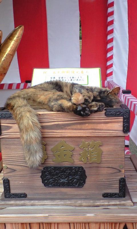 募金箱の上に横たわってひなたぼっこしている猫が…w