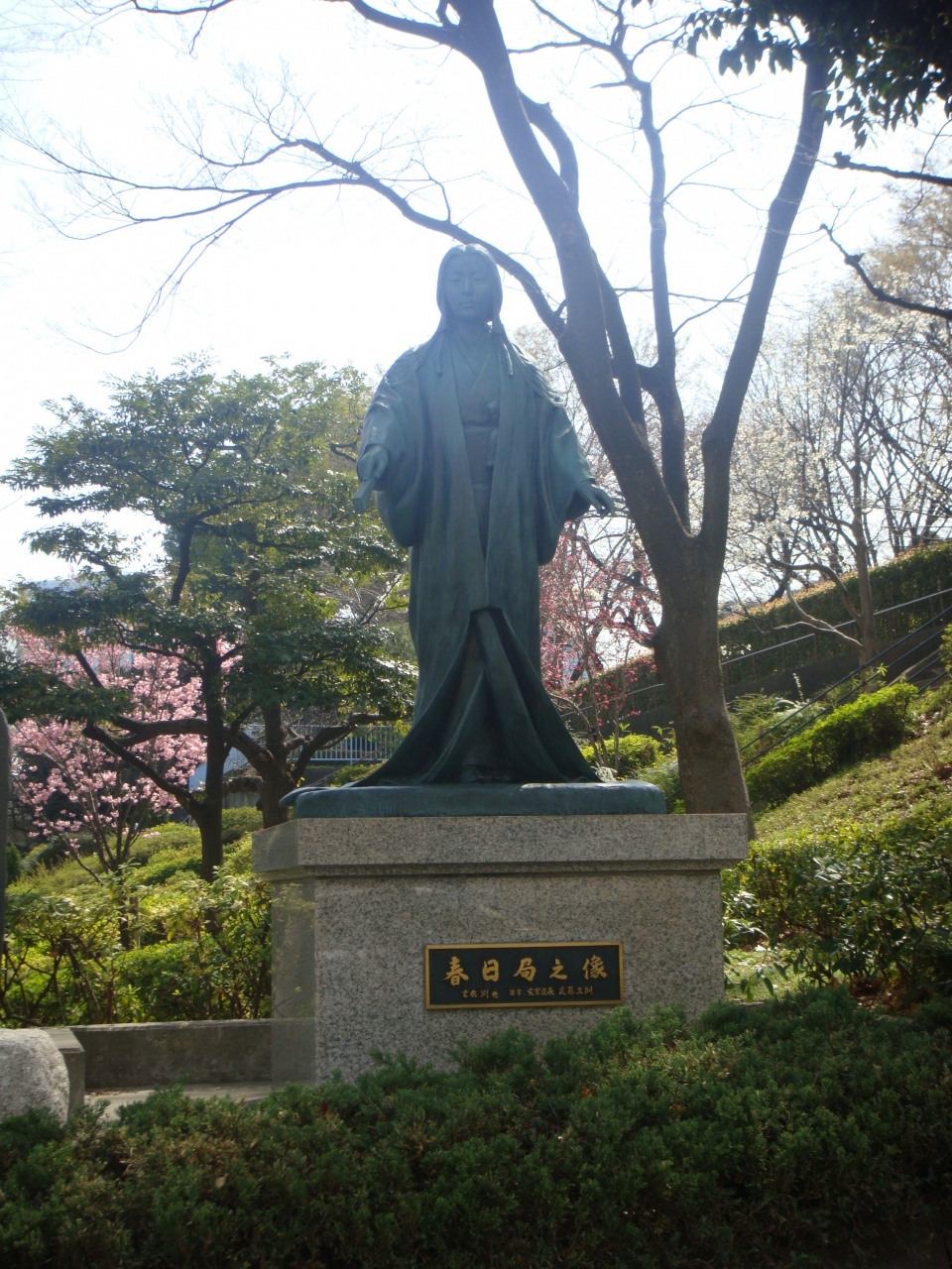 文京区役所のとなりの礫川公園にある春日局像です。春日局は徳川家光の乳母で、大奥をつくった人でもあります。この春日という地名は春日局が家光から与えられた土地の名前に由来があり、昔は春日殿町とよばれていました。また墓は湯島の麟祥院にあります。