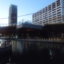 道頓堀川にかかる橋でなんばハッチの前にあります。夜に行きましたが蛍光ランプが点灯していてきれいでした。この橋は歩行者しか通れないです。橋はワイヤーで吊ってある吊り橋で長さが約70メートルあります。JR難波駅周辺に来られた時は一度来られたらいかがでしょうか。