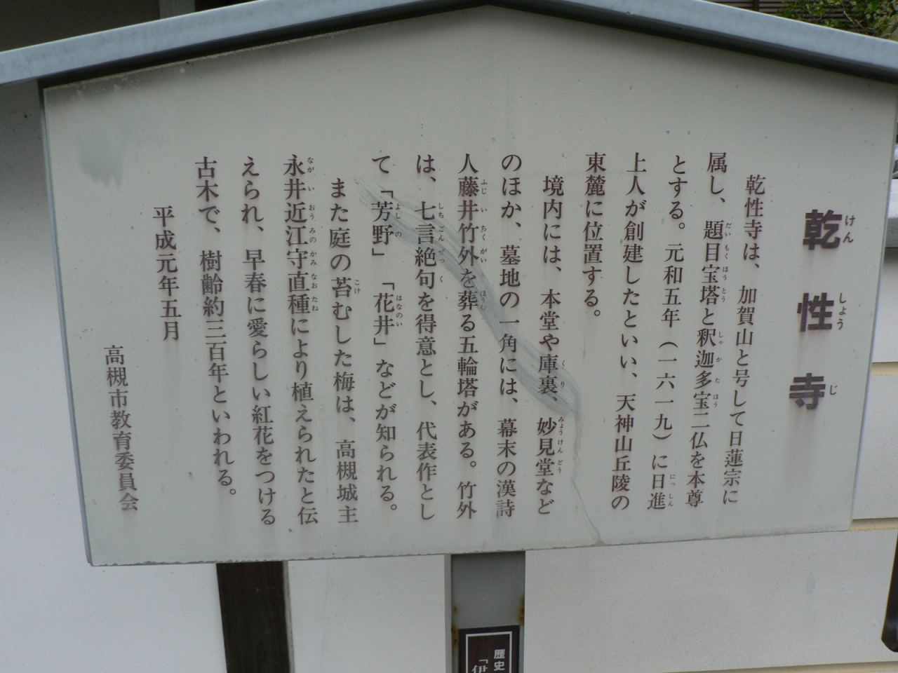 乾性寺(けんしょうじ)は高槻市の日蓮宗寺院で1619年に)日進(にっしん)上人が創建したと伝えられている。