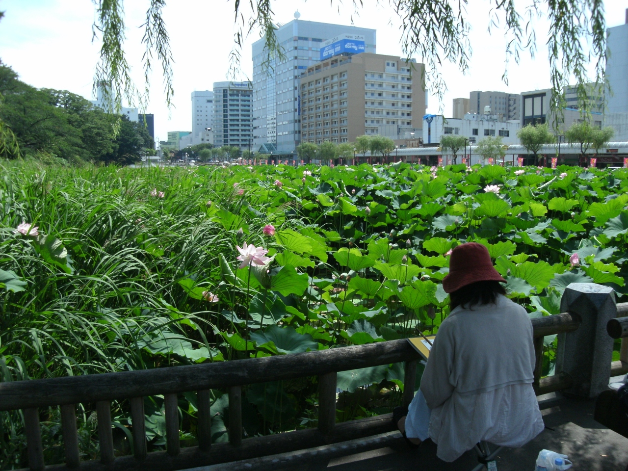 夏のある日のこと、千秋公園を散策したく公園入口から中土橋通りへ、そこから大手門堀方面(秋田駅方向)を望むとお堀とビル群がマッチしこれが秋田というスポットに出会いました(旅行情報紙やパンフレット写真で見たような)。8月初旬のお堀はピンクもハスの花が大開き・・デッサンする女性がとてもいい絵になりました。
