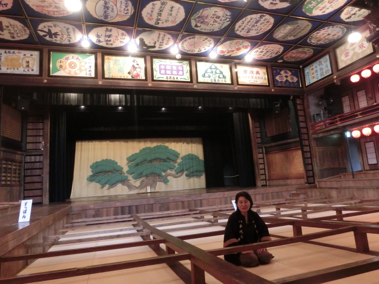 『奈落』と呼ばれる舞台下の回し舞台や、舞台の床から人が飛び出すリフト(どちらも人力)や、お客さんの後ろから登場するための地下通路の舞台裏?下?まで見せてもらえた。