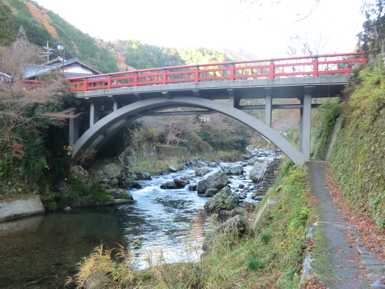 清滝川の清流、清滝川にかかる赤い橋、秋は周囲の山々の紅葉、