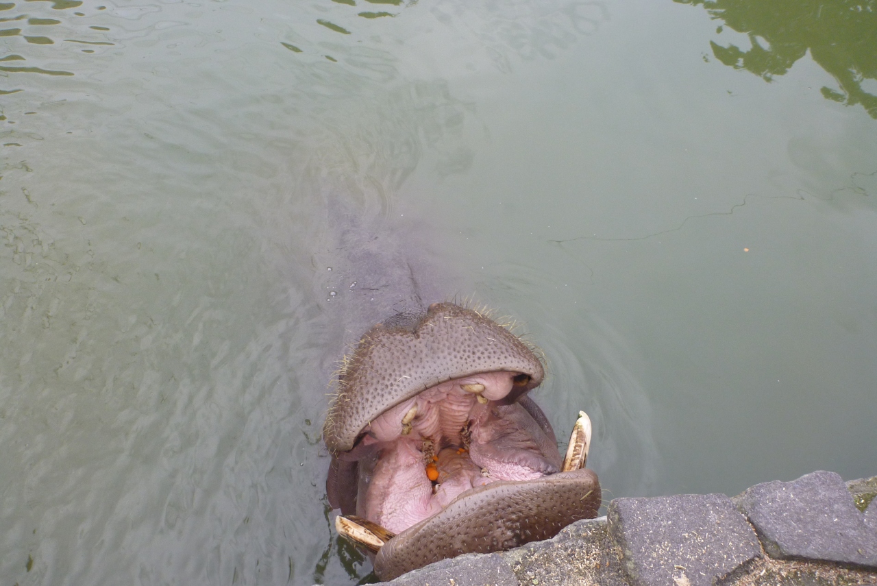 かばが大きく口をあけてえさをねだる姿が面白い。