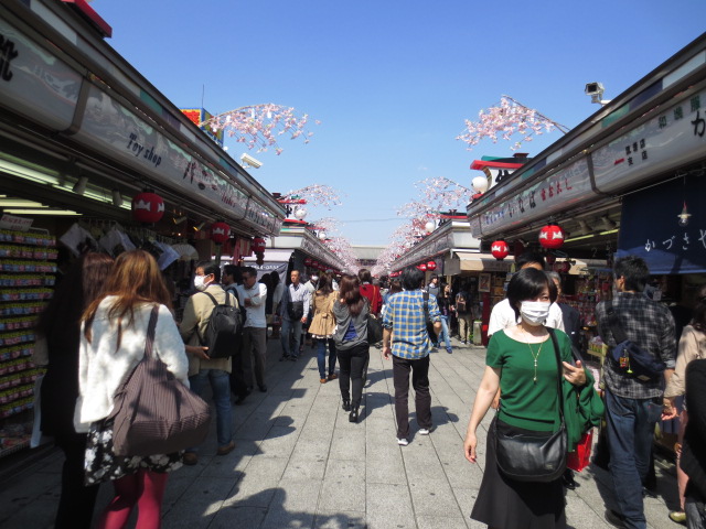 雷門から浅草寺までの道のりにたくさんのお店が並んでいます。
