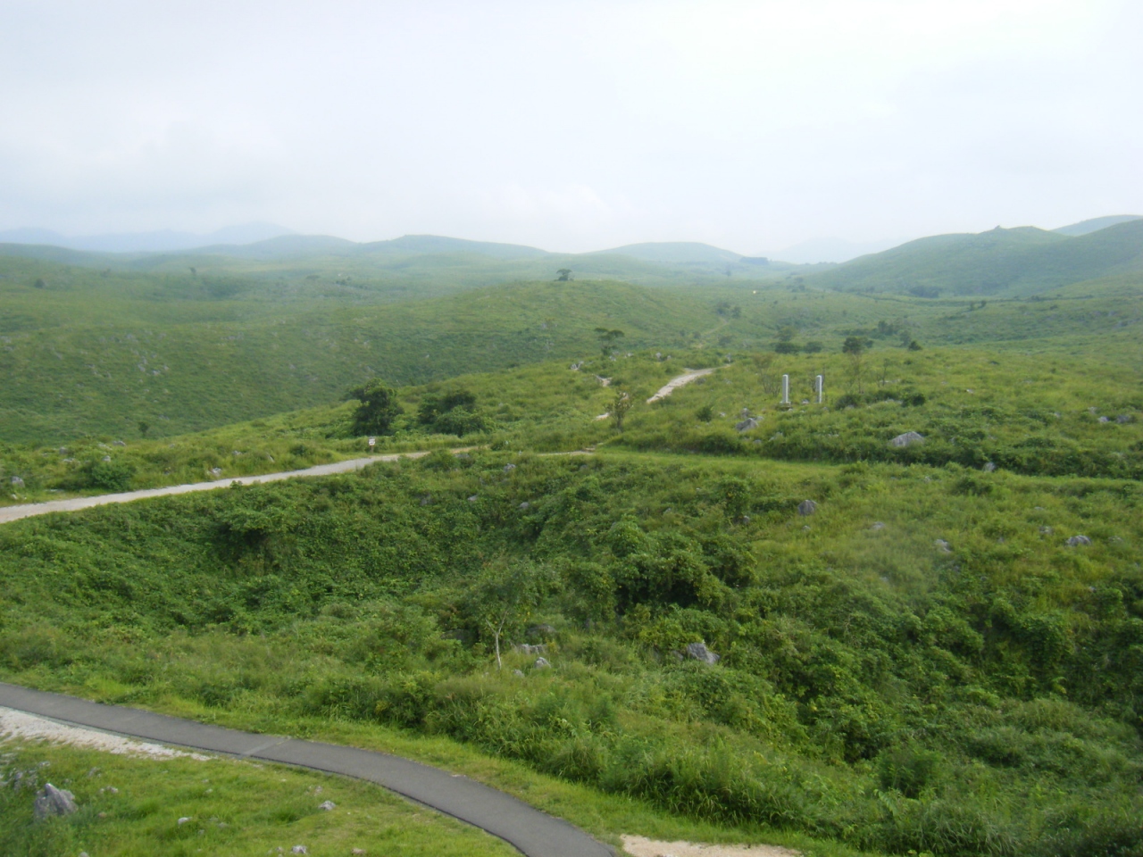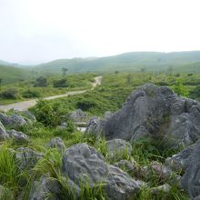 広がる眼下の山並みは草原で その中にカルスト台地ならではの突き出した岩があちこちに見られます。自然の大きさを感じたれる場所の見学できる展望台です。