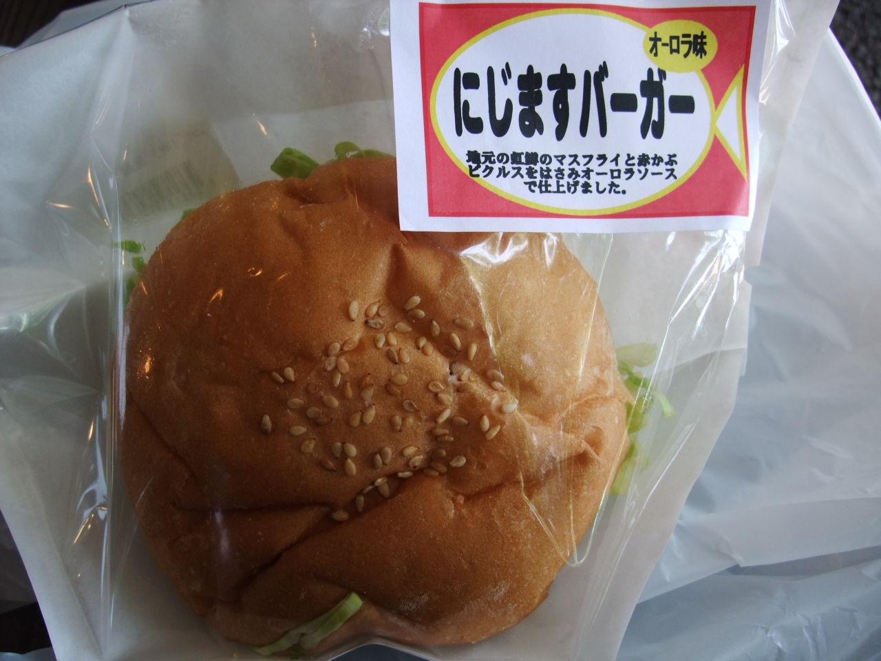 美味しい水がある醒井では、ニジマスの養殖が行われており、そのニジマスを使った「にじますバーガー オーロラ味」が売られています。鱒フライと、赤カブピクルスをはさんで、オーロラソースで仕上げた御当地バーガーです。