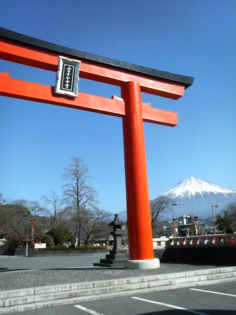 入口の大鳥居の横に富士山が見え、富士山を見ながら拝むことのできる神社です。