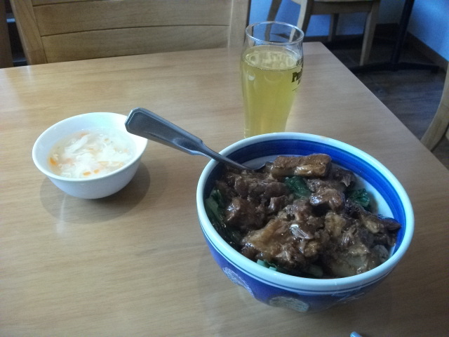 おすすめは豚軟骨丼。 中華系のスパイスの効いた関節肉と青梗菜の炒め物を丼にして、スープ付きで500円です。