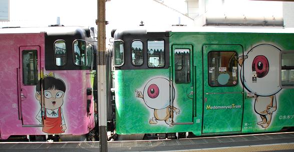 米子と境港を結ぶ境線。その上を走るディーゼルカーの一部の列車にアニメ、ゲゲゲの鬼太郎のキャラクターがデザインされています。