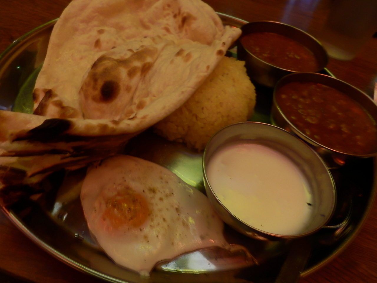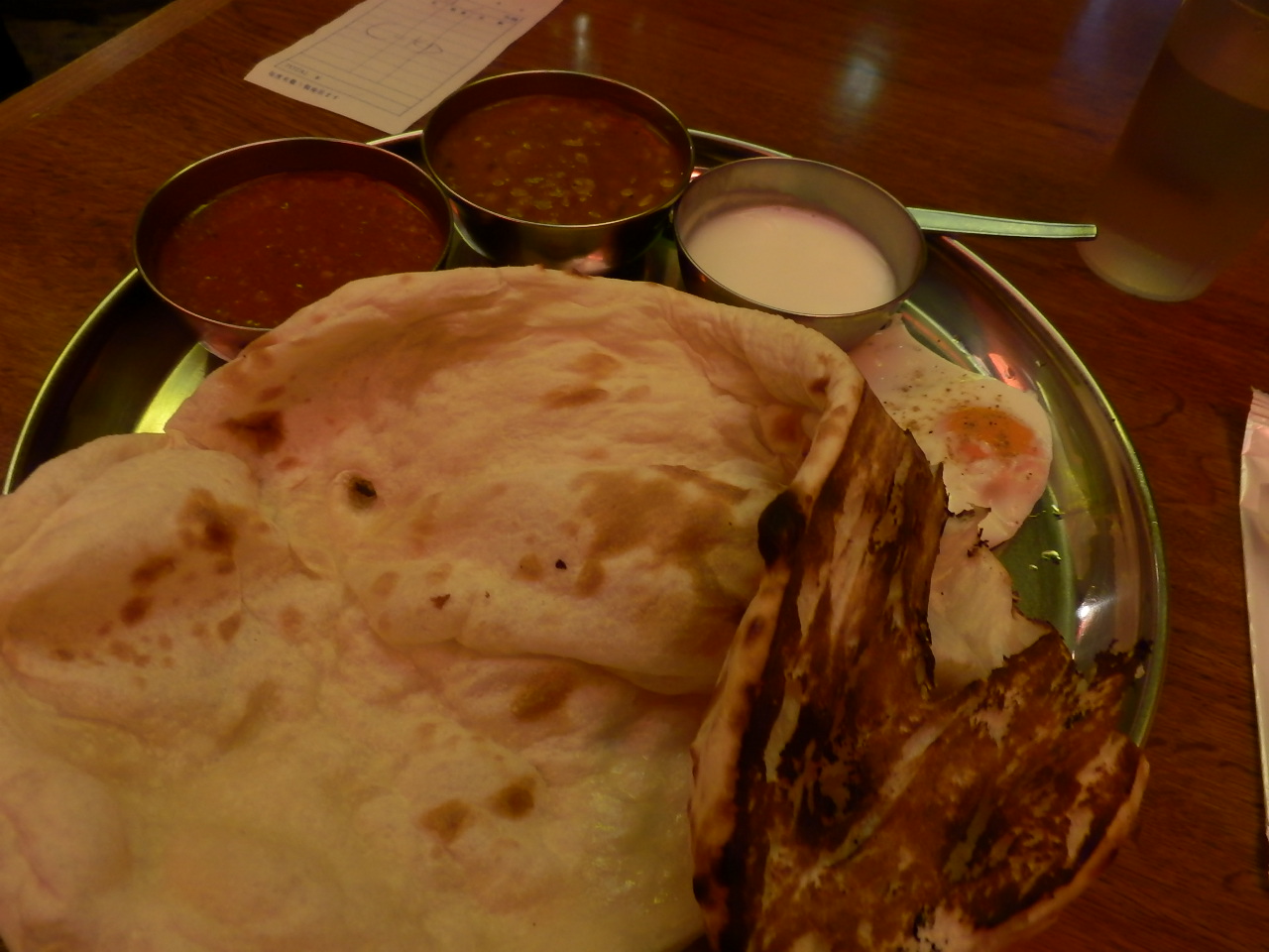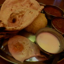 明治通り沿い、並木橋交差点に面する小さなビルにあるお店です。1階は狭くて満員だったので入れるのか不安になりましたが、地下にもテーブルがあり、12時ちょっと過ぎでも何とか入れました。1階の店先ではテイクアウトも販売されていて、そちらには列が出来てました。ランチメニューはお得で、カレー2種+ナン+カレー+目玉焼き+ヨーグルトで850円。大きなナンはお代わり自由で、大食いの方にも良いお店だと思います。