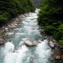 川沿いの露天風呂。ダイナミックな山々の景色に囲まれて、すぐ側には川がゴウゴウ流れているロケーションなので、とても開放感があります。混浴です。みなさんタオルをまいたりしているので、気兼ねなく入ることができました。