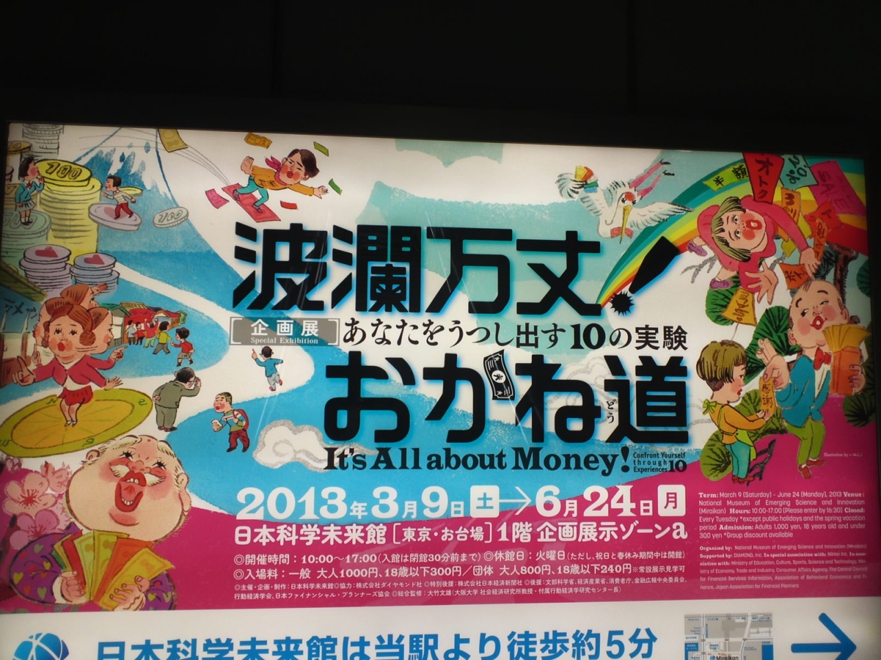 日本科学未来館で開催されている波乱万丈おかね道を見に行ってきました。 会場事態はそれほど広くないのですが、人気があるようで人がすごかったです。基本的にはお金の目的を理解する構成になっているのですが、様々なゲームを通して学ぶようになっています。