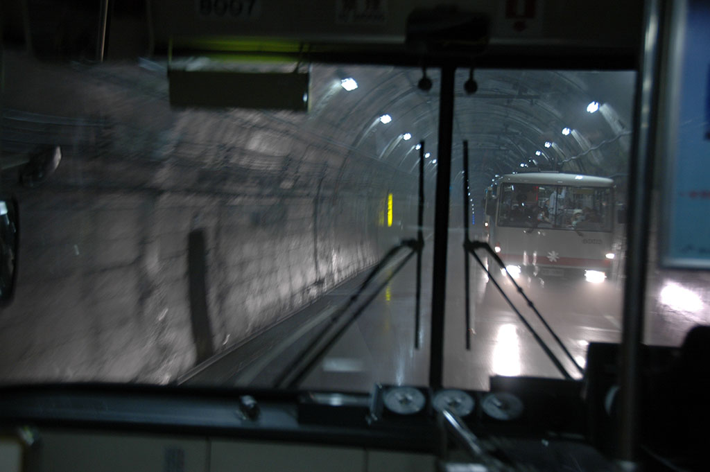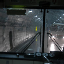 室堂から大観峰へと抜けるトロリーバスで、立山の真下を通ります。バスの中では解説アナウンスがあり、破砕帯と呼ばれる水が吹き出る層を突破するのに時間がかかった等、建設当時の苦労話なども聞けて興味深いです。バスの中からその破砕帯を見ることもできます。建設も大変だったでしょうが、ここを運転する運転手さんも狭い一本道で大変だろうなと思います。