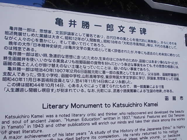 函館市内には有名な偉人に関する記念碑が数多く存在しますが、その多くは地元以外の出身者の縁だったりします。しかしこの亀井勝一郎に関しては函館生まれの生粋の地元民で、元町には生誕の地に関する記念碑もあります。文学碑に関しては、護国神社に向かう上り坂から少し脇に入った場所にあり、含蓄深い寸言が刻まれていますので、是非足を運んでみて下さい。