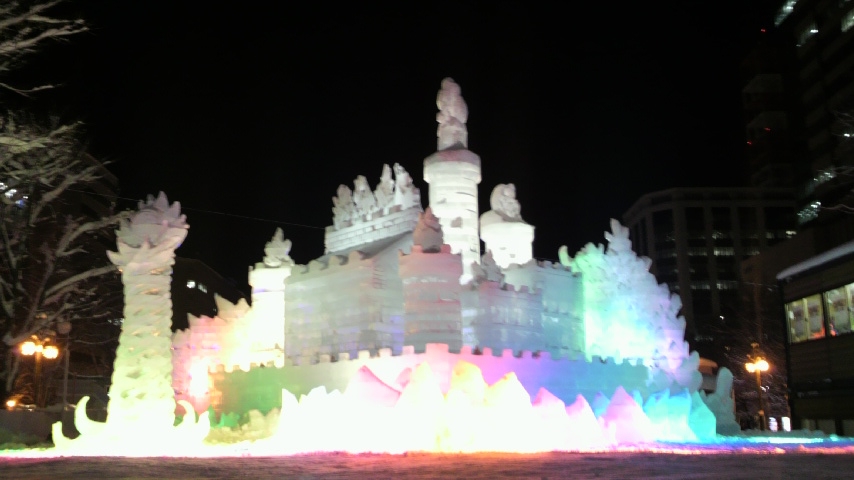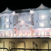 お昼には白い雪像が、夜には綺麗なライトアップが楽しめます。