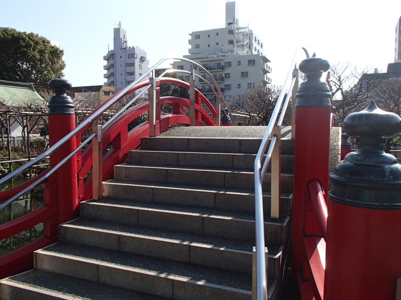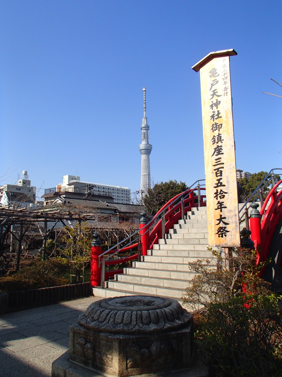 亀戸天神社 (かめいどてんじんしゃ)の太鼓橋です。この太鼓橋は、神社の大鳥居をくぐると心字池があり、3つの橋が架けれて、九州大宰府天満宮の境内にならって造られているみたいです。これは、三世一念の理を意識しているとの事で、橋をわたる事で心が清められます。