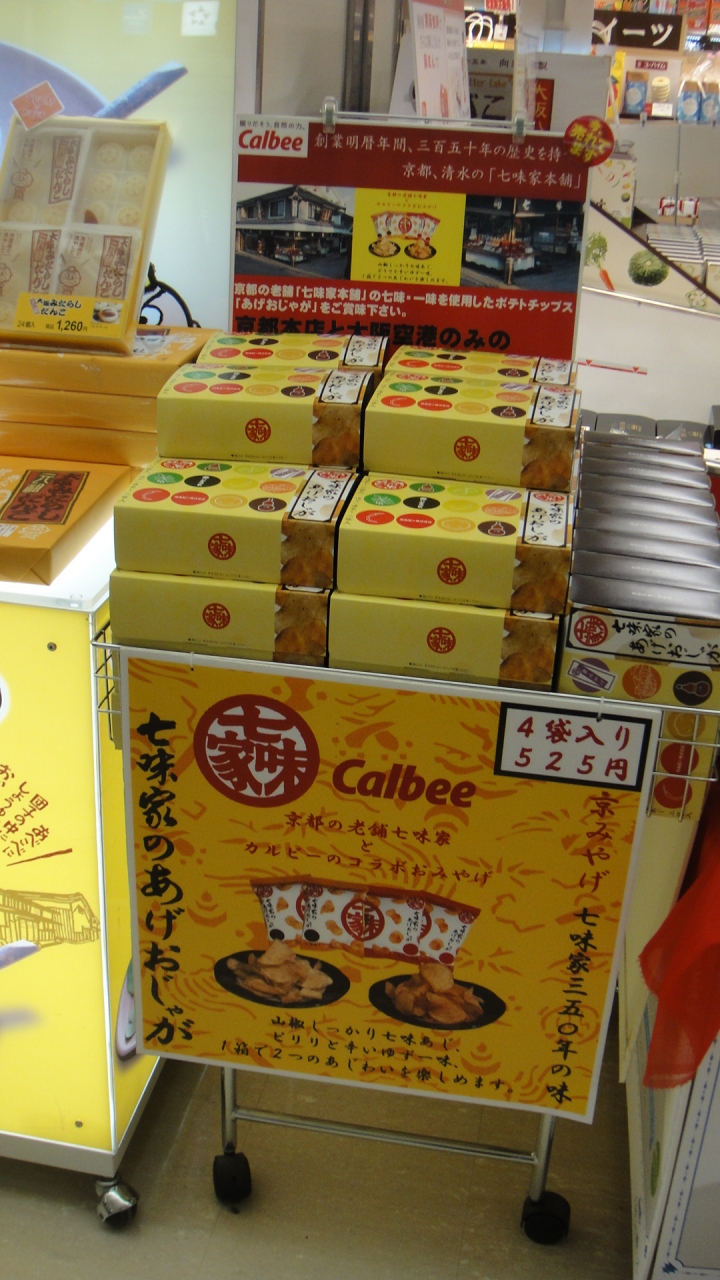 伊丹空港の2階にあるANA FESTA。手荷物検査場への入口の前なのですぐに見つかります。柚子一味と七味の2種類の味が入っている七味家のあげおじゃがは京都清水の七味家本舗の本店と伊丹空港のANA FESTAの限定発売品です。限定品を空港で買うことができるので重宝します。