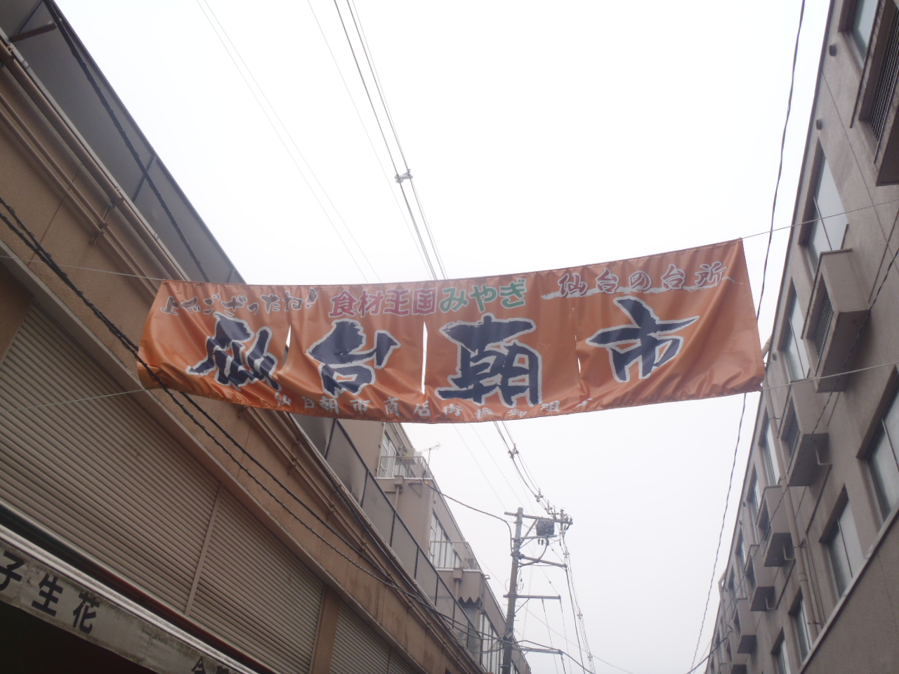 仙台駅西口を出て左手イービーンズビルの奥に広がる仙台朝市、通りの界隈には70ほどの店舗が並び、旬の魚や新鮮な野菜、果物などが所 狭しと並べられています。