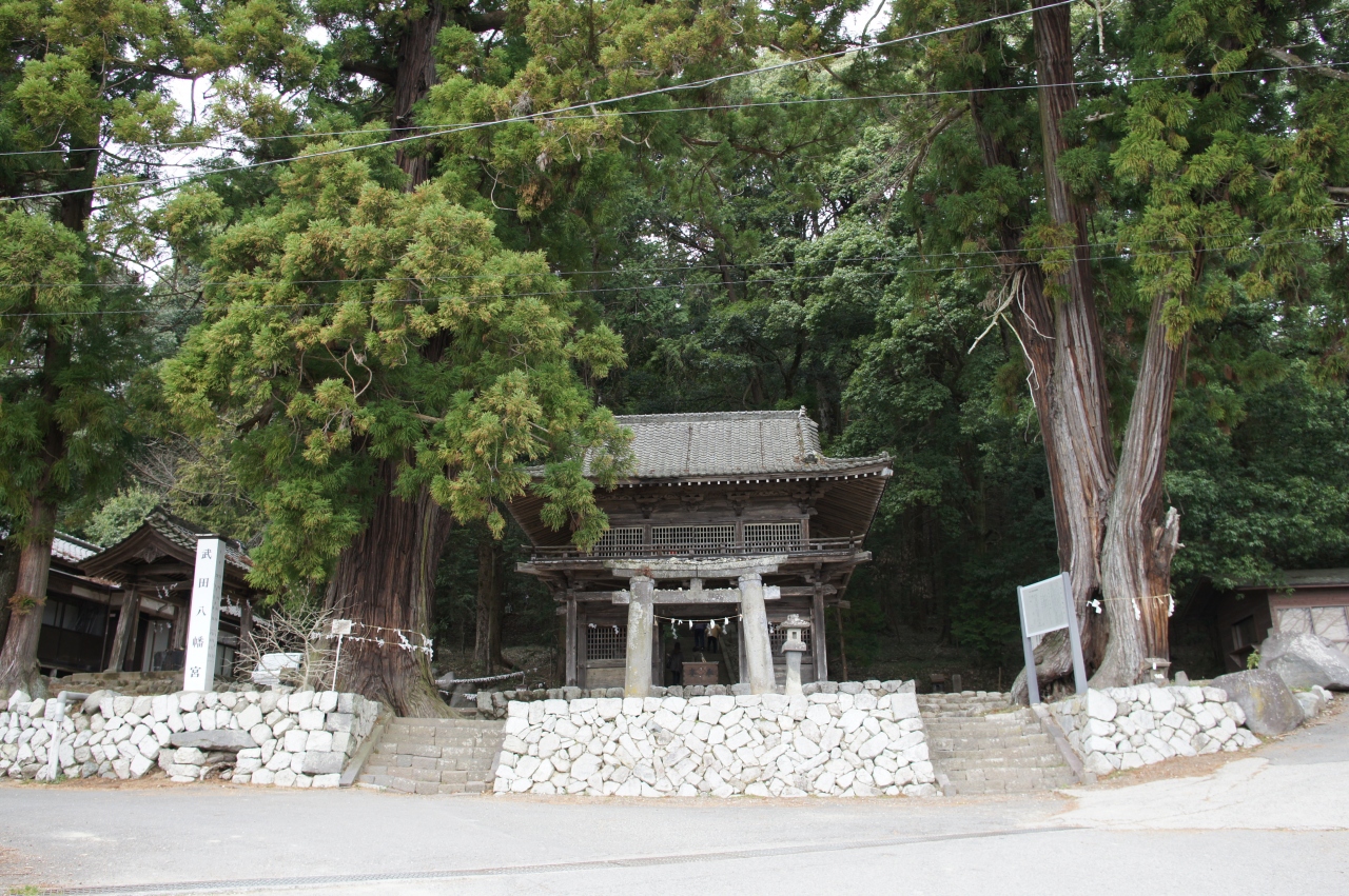 武田八幡宮は、わに塚のサクラから歩いてすぐ。だらだらと続く坂道を登って行くと、宮島の鳥居のような形の二の鳥居。さらに登って、小さな石の鳥居と山門が組み合わさったちょっと珍しい門前にたどり着きました。一帯は傾斜地で、これを見下ろすようなロケーション。日本武尊の子である武田王に因む神社としても、長く地域の信仰を集めた歴史を感じさせる神社でした。