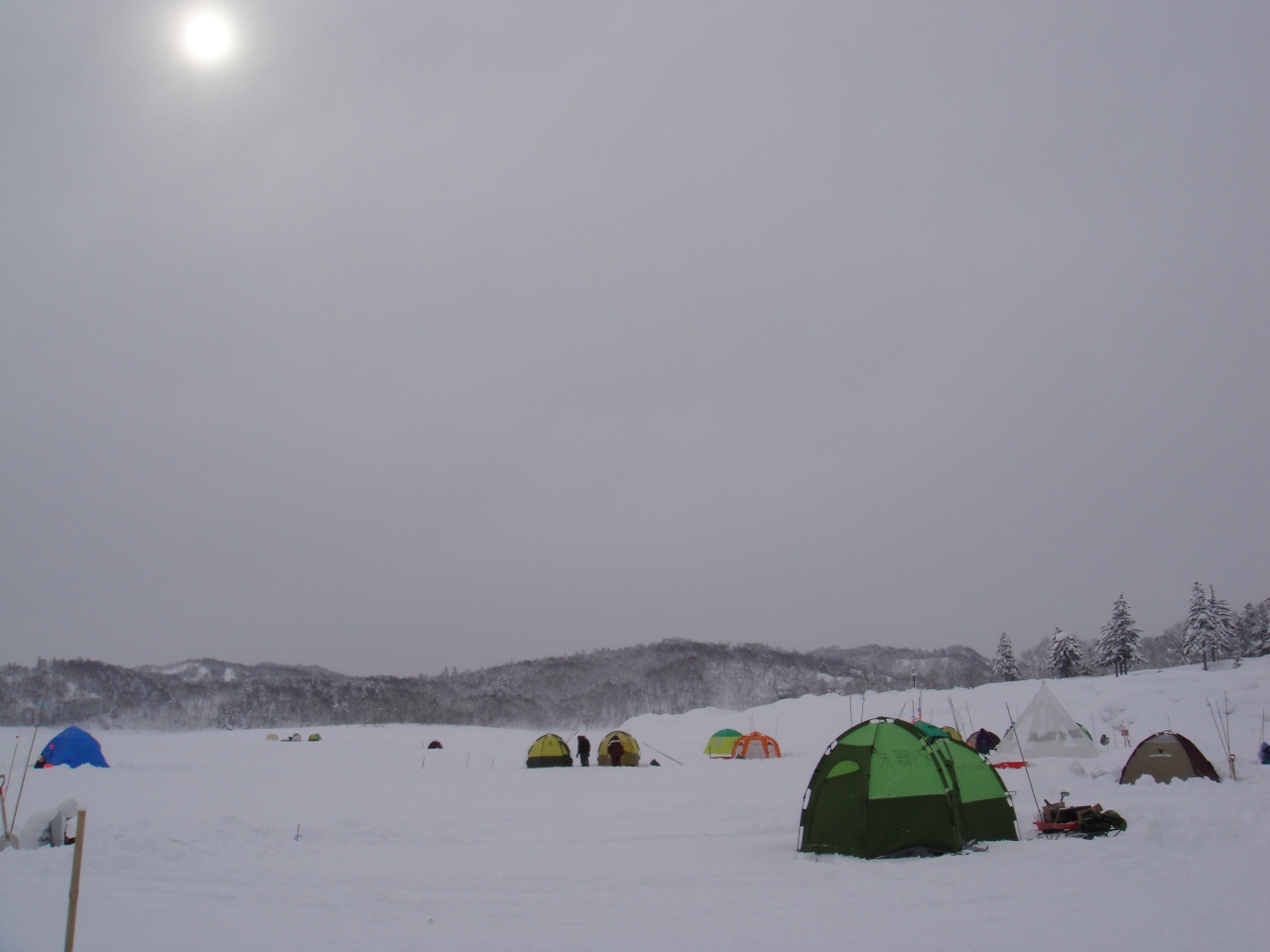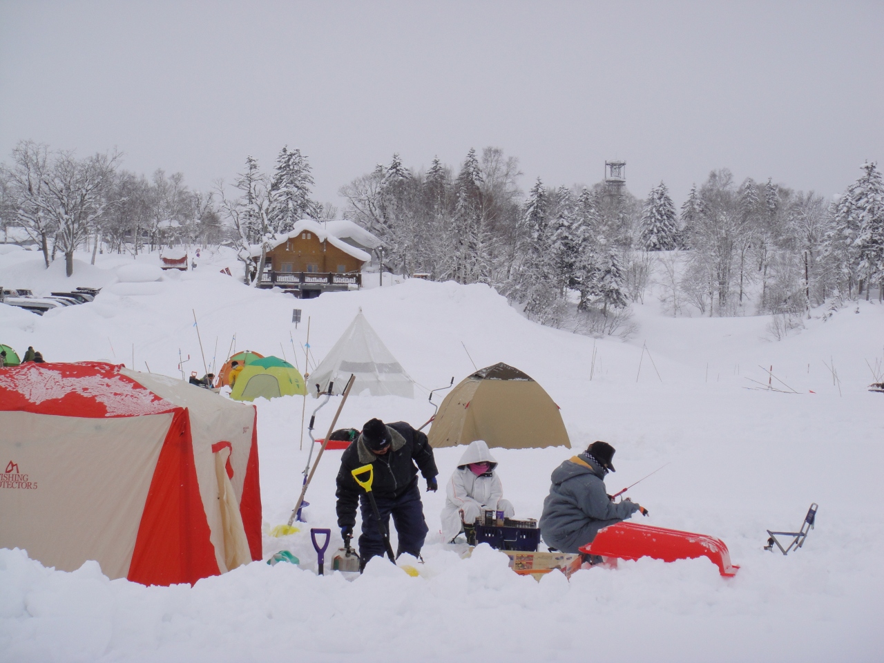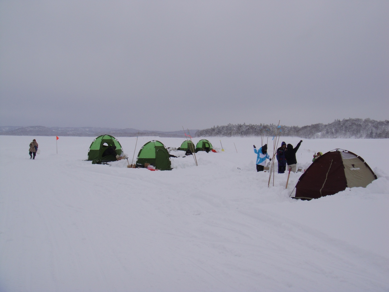 札幌周辺では、ほか茨戸方面と白老のポロト湖などでワカサギ釣りができるそうですが、ここはよく釣れるのだそうです。(他は分かりませんが、素人の初体験でも本当によく釣れました。)釣りあげたワカサギはすぐ凍ってしまいました。ちょっと不便なところにありますが、朱鞠内湖では寒さと老若男女、素人でもできるワカサギ釣りが体験できます。