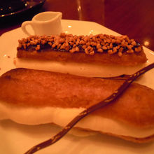 エクレアはツヤツヤで、食べる直前に自分でナッツをふるかけるタイプ。
