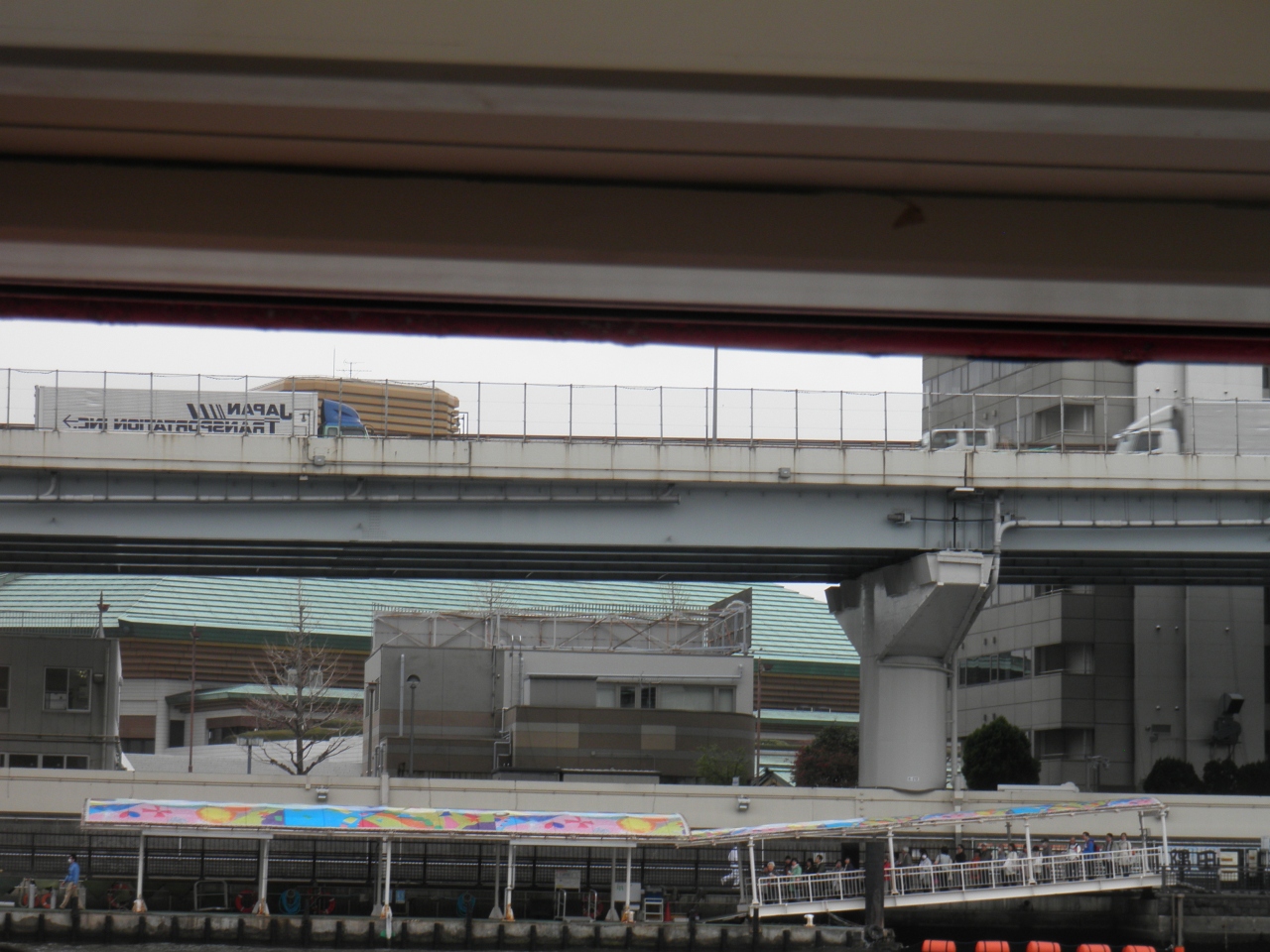 浅草から日の出桟橋まで、水上バスに乗りました。 蔵前橋を過ぎてからしばらくすると、両国の国技館のモスグリーンの屋根が見えてきました。 自動車橋にかくれているけど大きな建物ですね。 水上バスのコースは\760で約40分楽しめて、本当にお得で楽しかったです。