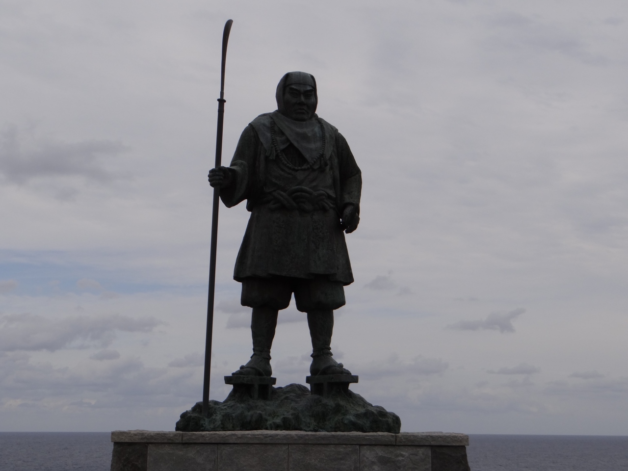 道の駅「みなとまーれ寿都」から5?くらい走っていると大きな弁慶像が見えてきます。トイレも有るパーキングエリアとなっていて積丹半島を望む海に背を向けた弁慶が何ともユーモラスな風景です。