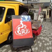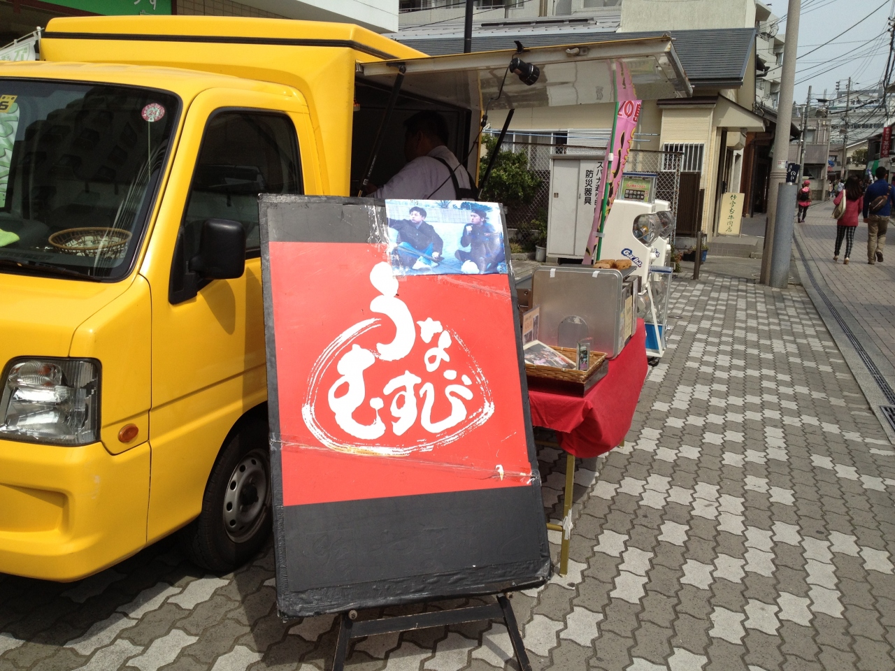 江ノ電江ノ島駅から江の島へ向かう洲鼻通りを歩いていると、「えのでんはうす」前にワゴン車で販売する「うなむすび」を発見しました。