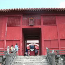 「奉神門」は、歓会門から始まって、五番目の門で、“御庭(うなー)”に続く最後の門です。奉神とは、“神をうやまう”という意味だそうで、別名「君誇御門(きみほこりうじょう)」とも呼ばれていました。門には3つの出入口がありますが、真ん中は国王などの高貴な人のみが通行を許された所で、役人は両側の門を通行したとのことです。現在は首里城観光の有料ゾーンと無料ゾーンの分岐の門となっています。
