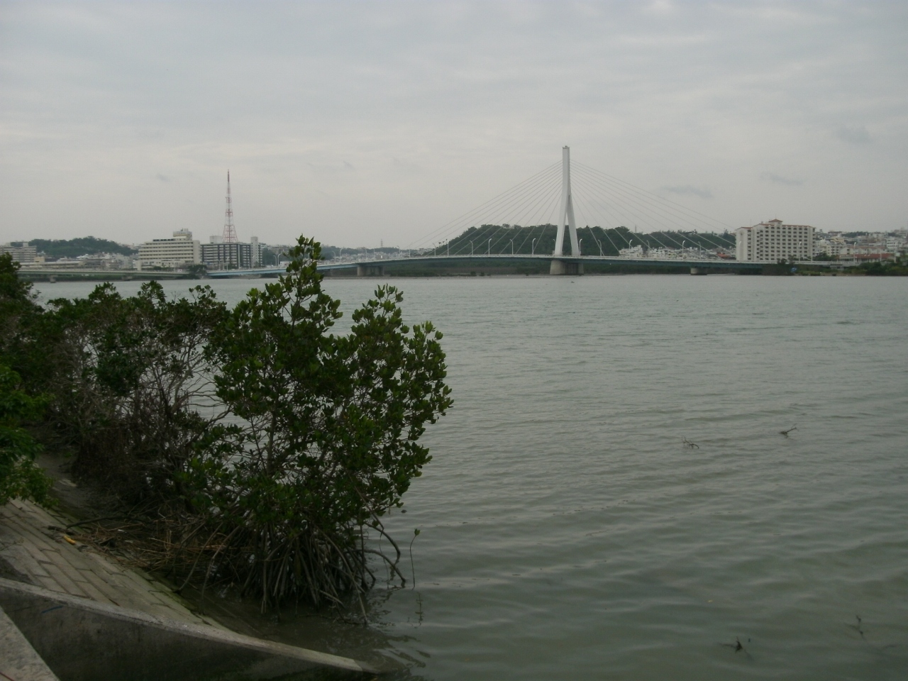 「漫湖公園」は、那覇と豊見城の境にある公園で、漫湖は湖という名前が付いていますが、広大な干潟のことです。汽水域といわれる海と川が混ざり会う場所で、マングローブや藻などの植物や小魚、貝類の繁殖がさかんで渡り鳥の飛来、生息場所になっています。那覇の様な大都会の近辺でマングローブを身近に見ることができるのが珍しいと思います。那覇市側(川の北岸)には“ちょうちょガーデン(入園無料)”があり、オオゴマダラとリュウキュウアサギマダラを観察することが出来ました。