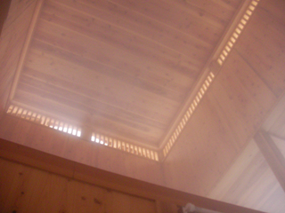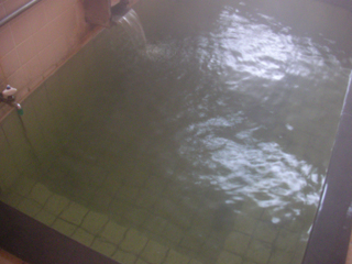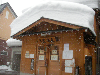 麻釜の湯に入った後は、雪が強くなった中を裏の山を上っていくと、旅館街の高いところにある真湯に着きました。最近建て替えた新しい建物で、天井に明かり採りがり明るい雰囲気です。浴室に入ると、湯船が一つで大量に源泉が投入されており、先客が水で埋めていますが、熱くて入れない温度です。もう一箇所の水を入れて、なんとか水の周りだけ入れるようになりました。温泉は緑色で、黒い湯の花も舞っています。