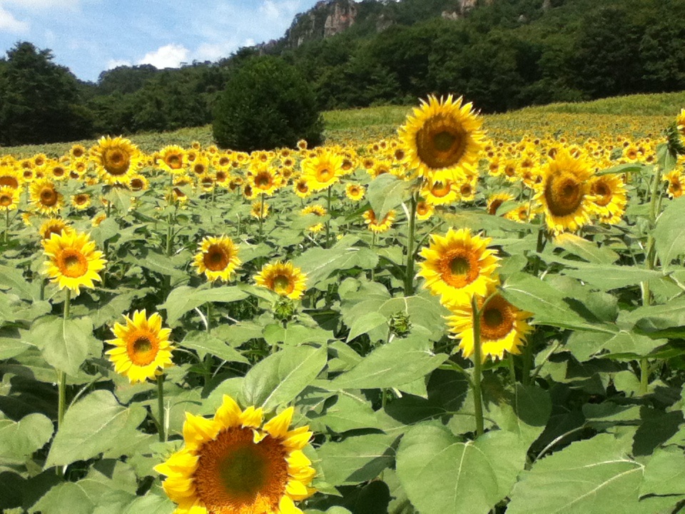 ひまわりにしては少し遅咲きのひまわりです。斜面いっぱいにひまわりが咲き誇ります!見事です!場所はたしか山道みたいなところをずんずん突き進む感じで、お世辞にもアクセスは良くないですが、だからこそこの景色が実現したのだと思います。ひまわり畑は斜面で足場もよくないので、歩きやすい靴をおすすめします。