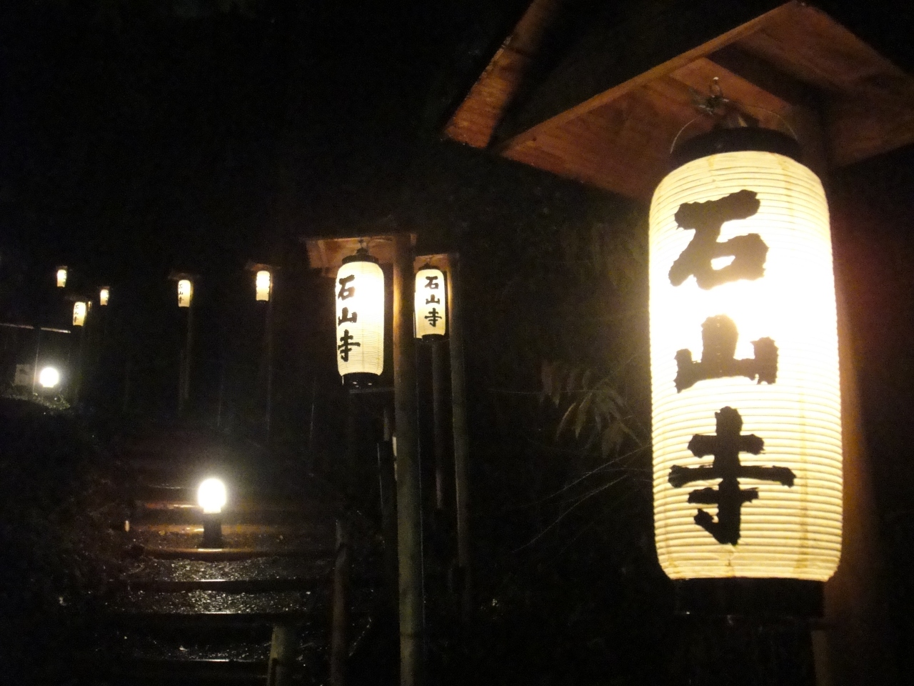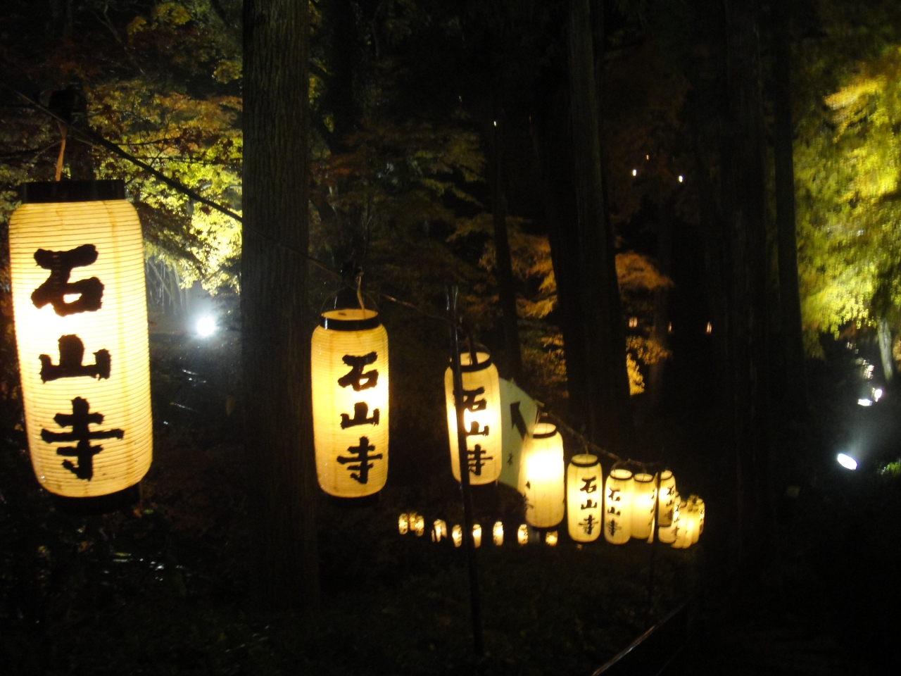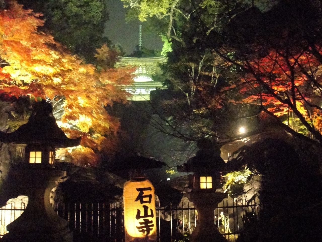 紅葉の時期、ライトアップとともに狂言など数日に渡って催し物を行っています。京阪電鉄の石山寺駅からは1kmあまり、タクシーを利用するとよいかと思います。行った日は雨でしたがライトアップされた紅葉にしたたる雨の中、狂言の公演も良かったです。