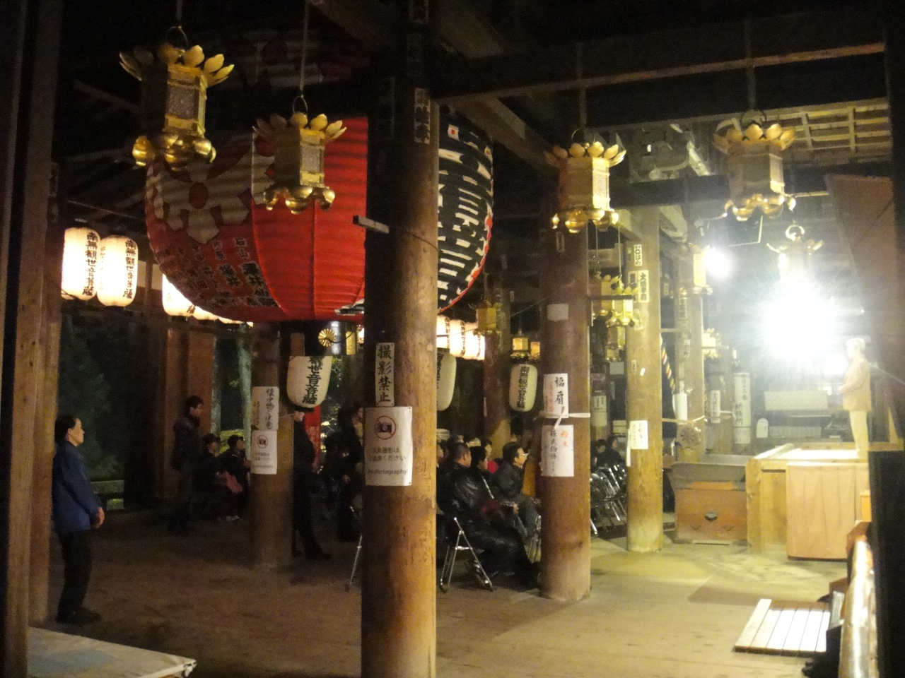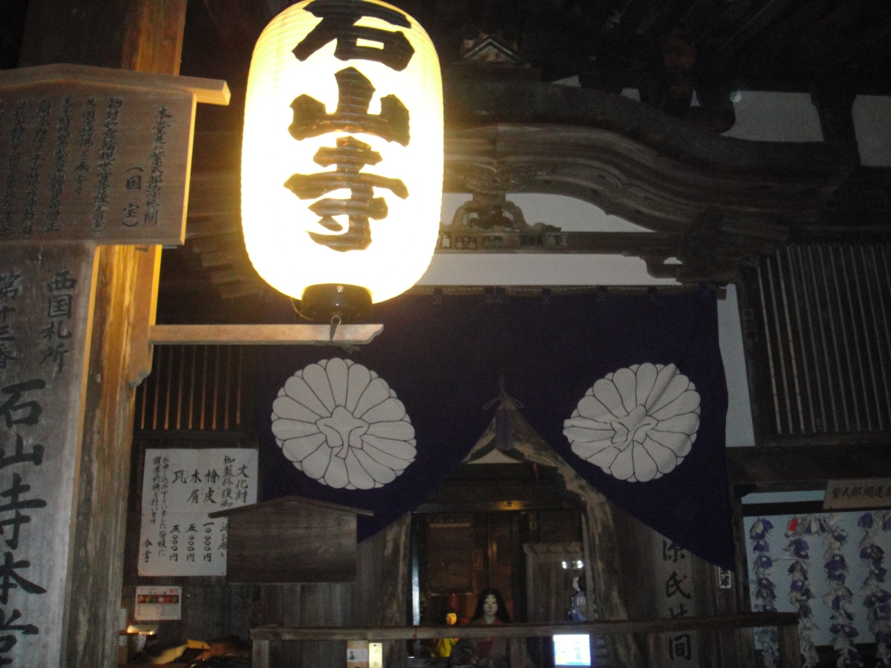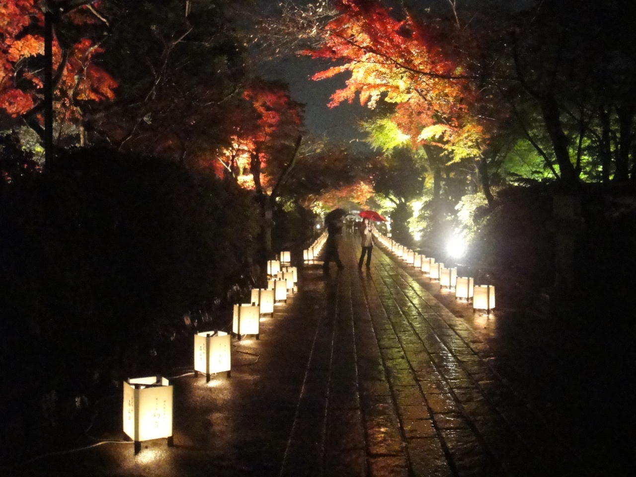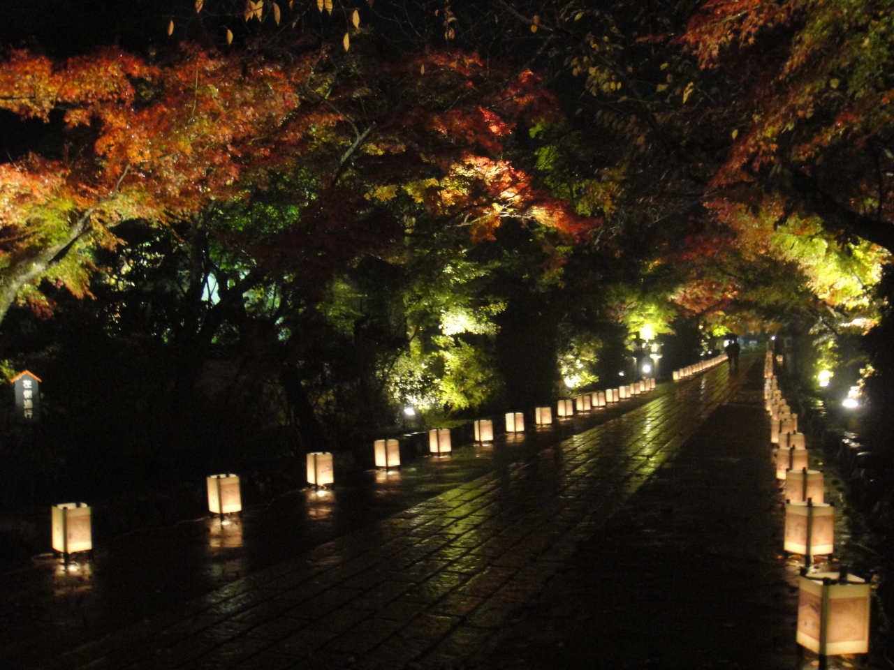 紅葉の時期、ライトアップとともに狂言など数日に渡って催し物を行っています。京阪電鉄の石山寺駅からは1kmあまり、タクシーを利用するとよいかと思います。行った日は雨でしたがライトアップされた紅葉にしたたる雨の中、狂言の公演も良かったです。