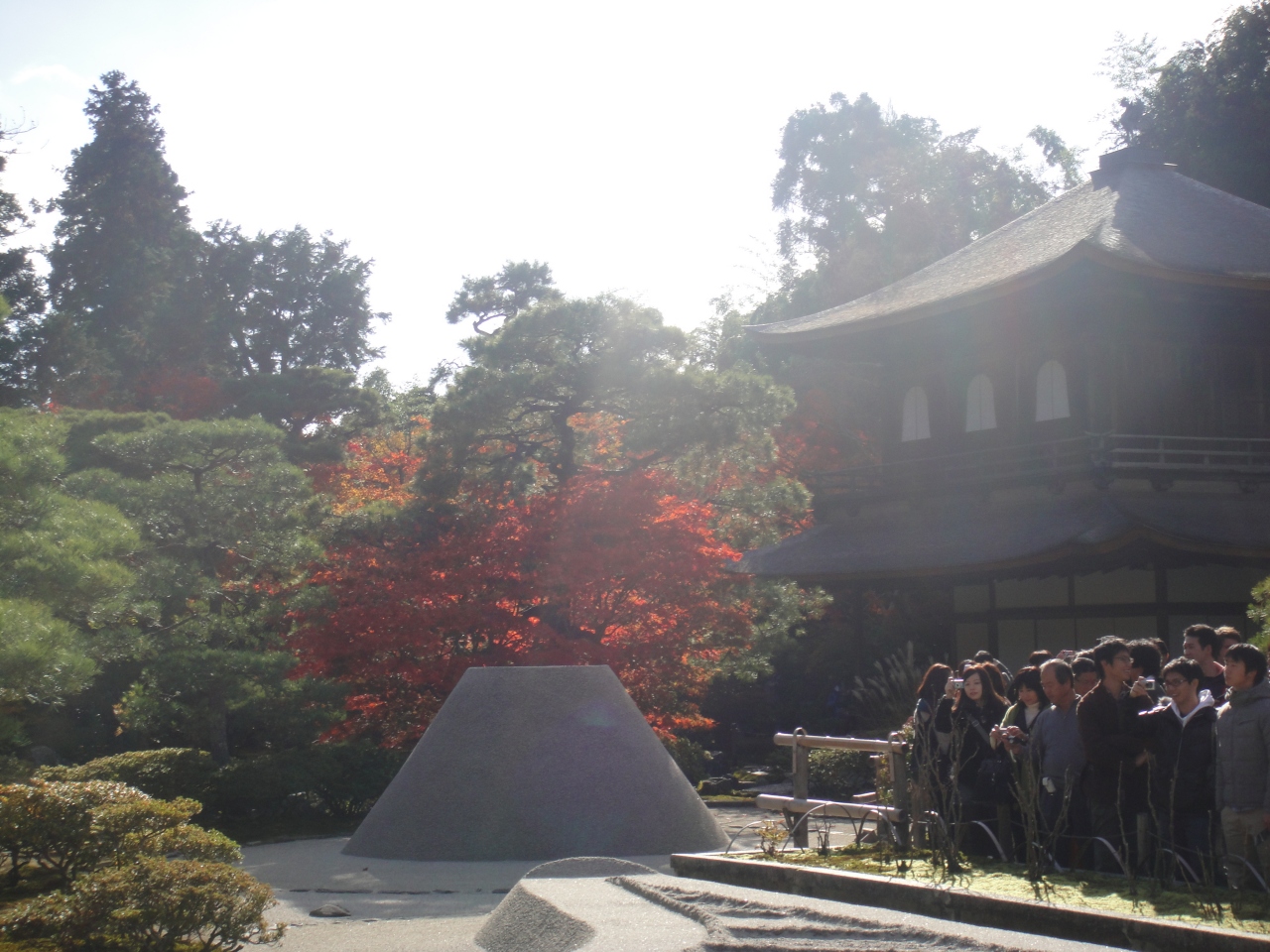 紅葉の銀閣寺に行ってきました。東山にあるので午後の西日が当たるほうがよく見えるのかと思いきや、銀閣の建物は東を向いており影になっていました。また、人手も午後の方が行きやすいのか、いっぱいでした。銀閣寺は午前中に行くべきです。