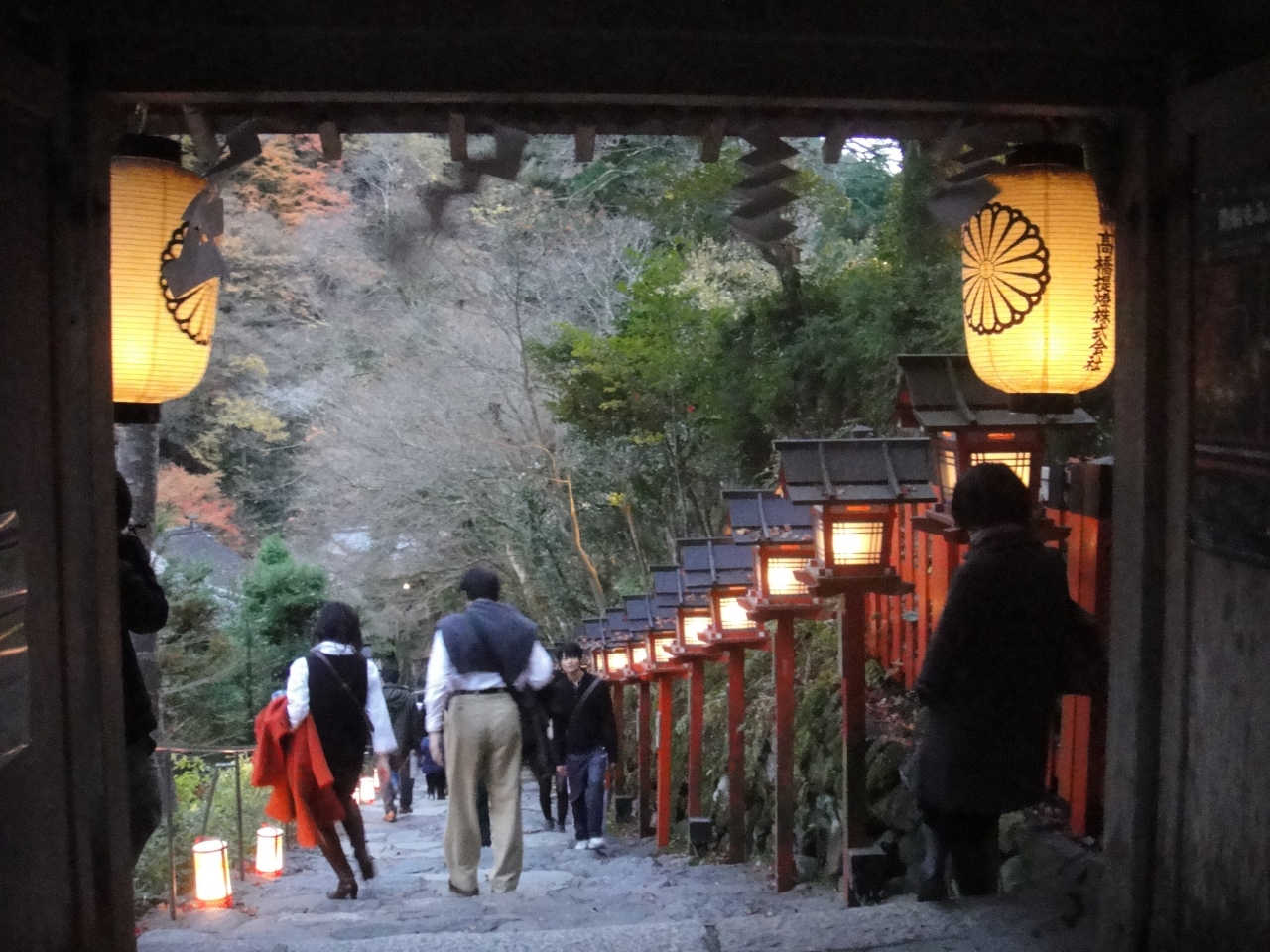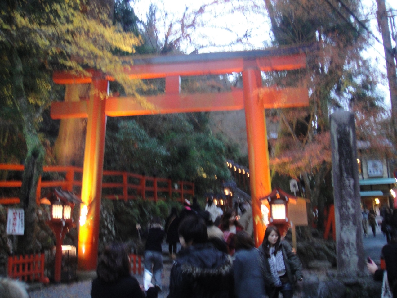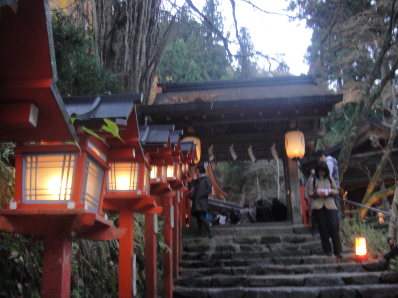 鞍馬山の帰りに貴船神社に寄りました。秋の紅葉に併せていきました。さすが山の中です。街中に比べ、結構気温が低かったです。休日に合わせて奉納ミニライブなどの催し物もやっていたため、かなりの人混みでした。縁結びのご利益というだけあり、女性の参拝客がかなり多かったと思います。貴船口の駅、本宮、奥宮の間の道は結構細い割りに(1車線?)観光シーズンだったため、交通量も多いです。また駅から本宮まで約2kmと距離の坂道を登ることになるので時間には相当余裕を持った方がよいです。