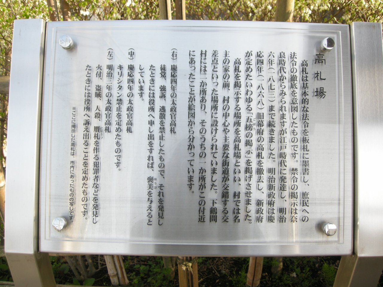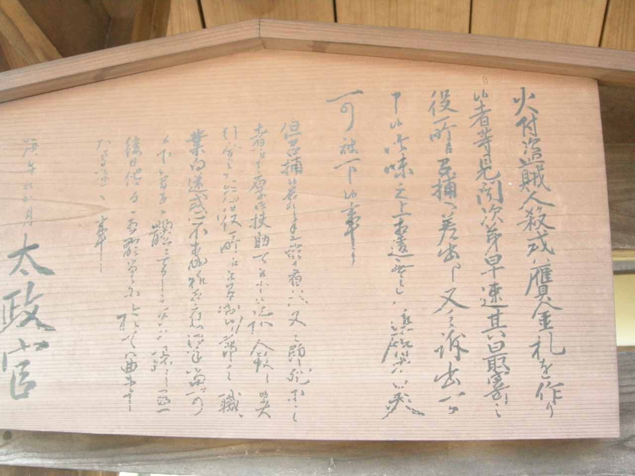 建物脇には高札場が再現されていて達筆な文字で火付盗賊改めや切支丹などの高札がかかっています。