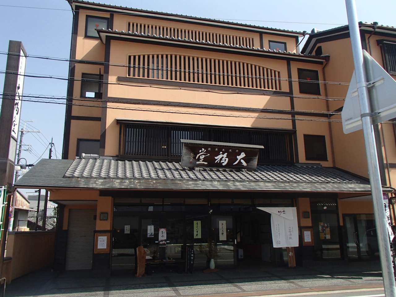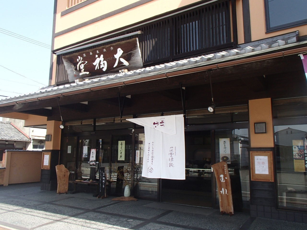 大福堂 (ダイフクドウ)は、丹波篠山栗菓匠で、商店街から近く、開けた道路沿いにあります。すぐに見つけられます。有名なのが、栗饅頭で、丁寧に仕上げた栗の甘露煮を細かくきざみ、白あんに炊き入れ大福堂自慢の生地で包み焼き上げています。ぜひ、一度、