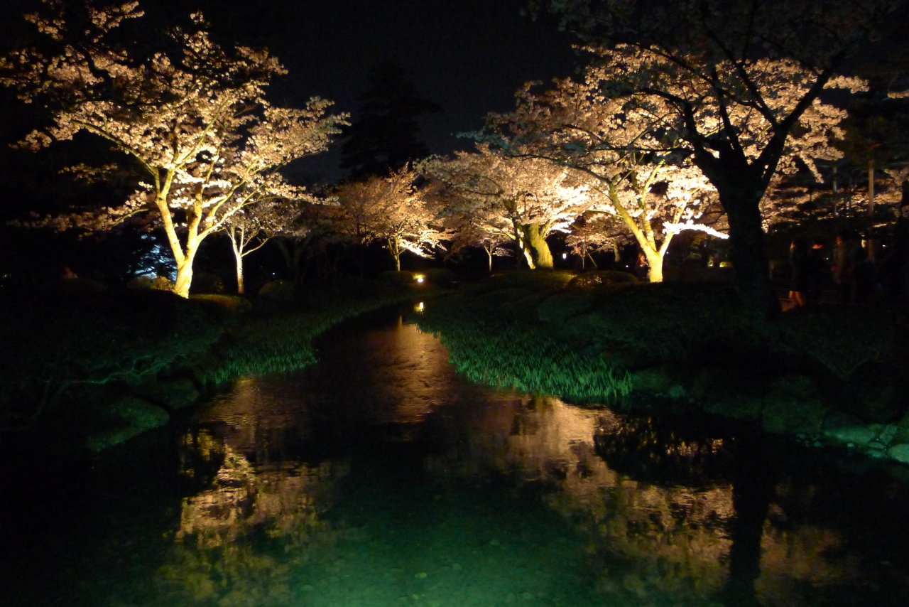 観桜期の4月上旬の1週間(年ごとに変わります)、毎日、午前7時から午後9時30分まで兼六園が無料開放されます。また、期間中、夜間園内や隣接する金沢城が午後6時から午後9時30分までライトアップされます。夜間おすすめのコースは、兼六園下交差点から紺屋坂を上り、右折して金沢城へ、石川門から入城し、四十間長屋菱櫓左手、河北門を右手に見ながら堀沿いに進み、堀の突き当たりから振り返ると堀にかかる桜並木が堀水に映っている。往路を戻り兼六園へ、園内はどこも見所だが、城側正面入り口の桂坂沿い、眺望台の見晴らしを見ながら奥手に進んで花見橋からの曲水沿いの桜、霞ヶ池南側へと周り、さざえ山脇から階段を下りひさご池の桜と翠滝、噴水、江戸町通りの茶屋と桜並木、21世紀美術館側へと降りる真弓坂の桜がすばらしいです。