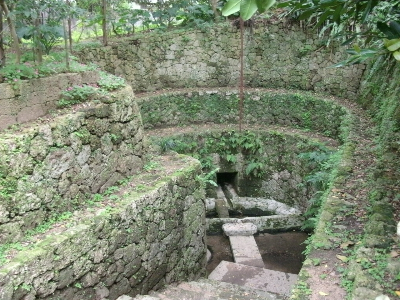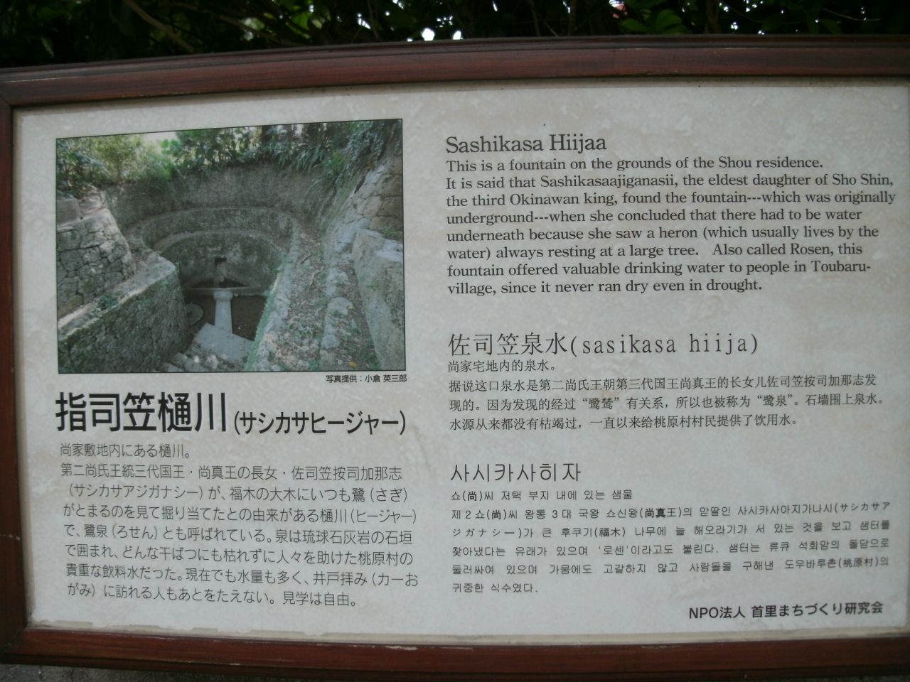 「佐司笠樋川」は、首里城公園の北、約500m、琉球最後の国王、尚泰の四男、尚順の屋敷だった“松山御殿”のすぐ裏側、尚氏敷地内にあります。ここは、琉球国の黄金時代を築いた尚真王の長女、佐司笠按司加那志が、フクギの大木にいつも鷺が止まるのを見て掘り当てたとされる樋川です。琉球石灰岩の石積みが見事な樋川には今も水が流れ、周りには多くの緑が茂り、静かで大変雰囲気の良いところでした。観光客が殆ど行かないところですが、近くに来られたら是非、拝まれることをお奨めします。