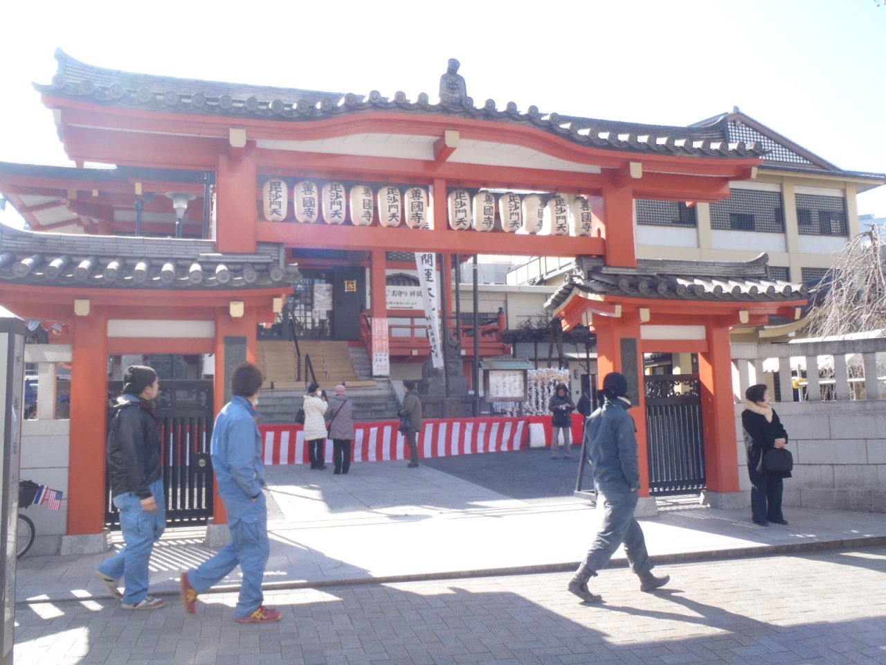 新宿神楽坂にある毘沙門天(善國寺)朱色の門がとても印象的で参拝者が絶えない。
