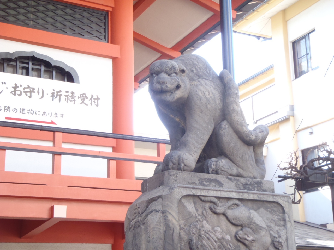 狛犬があるのですが、よく見ると体に縞模様が、顔をよく見るとなんか犬には見えない。