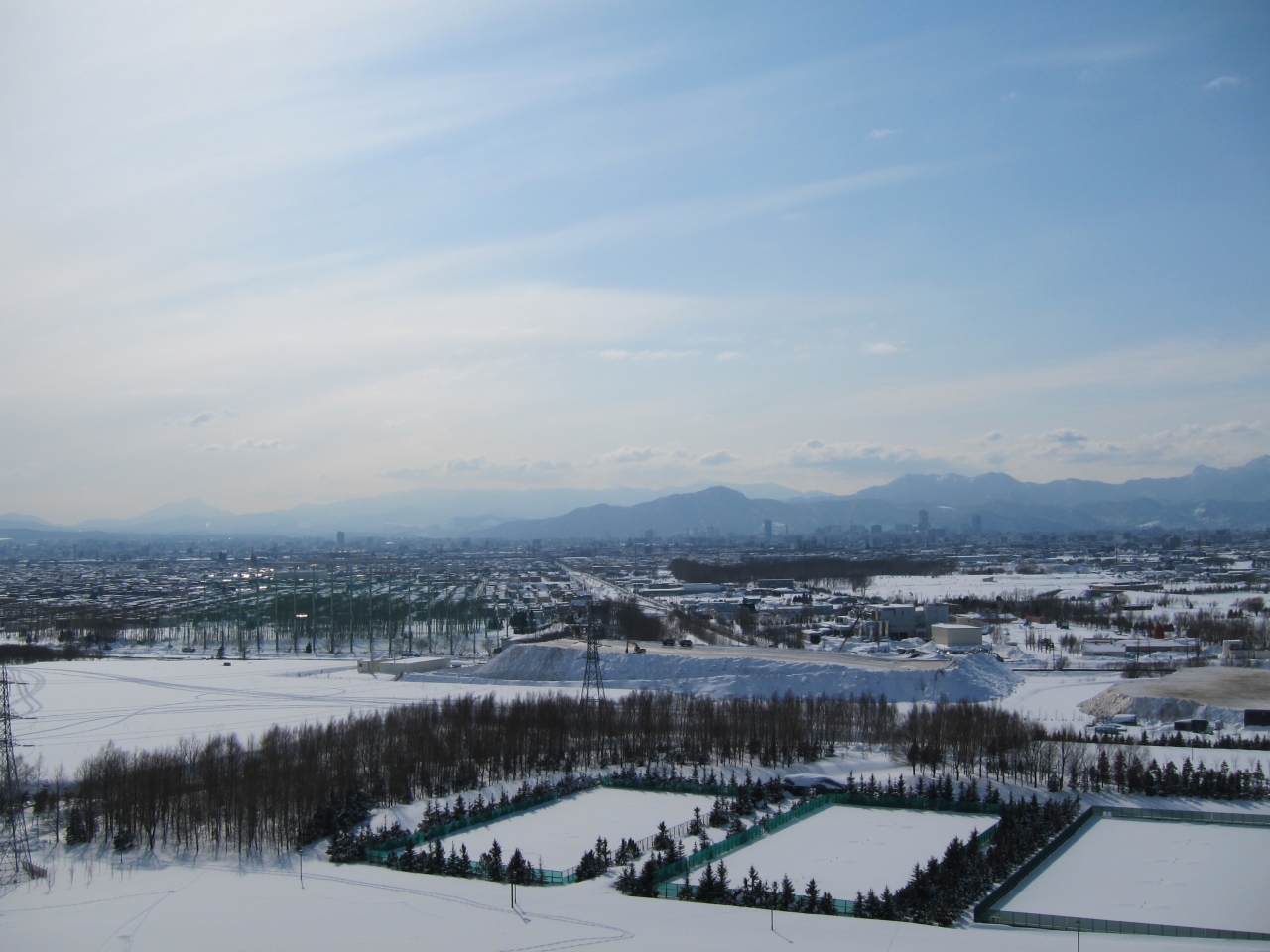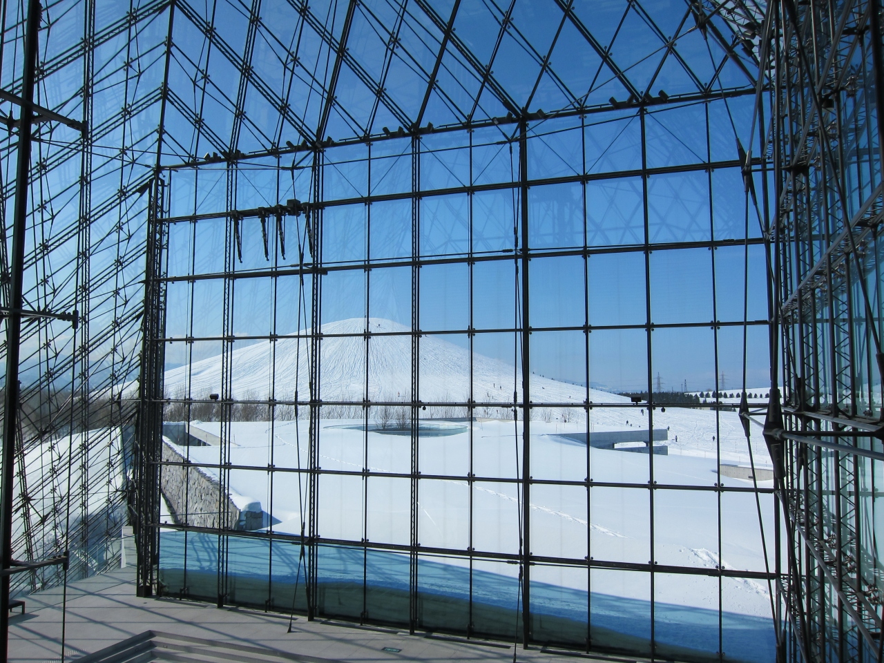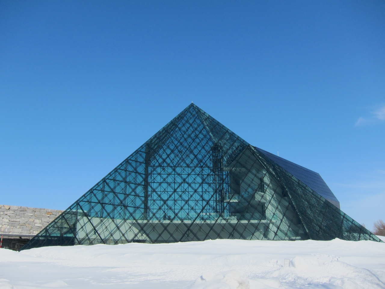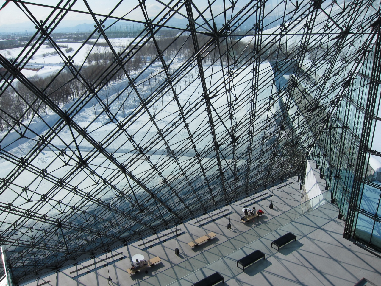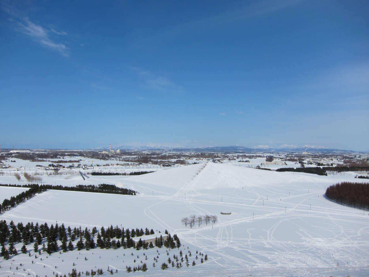 冬のモエレ沼公園はクロスカントリーコースのようになっていました。ただ、そんな専門的なものでなく、歩くスキーといった感じで子供からお年寄りまで楽しんでいました。用具はレンタルしています。モエレ山も雪に覆われ、スキーで滑り下りた跡がいくつも残っています。山の上からは札幌市内のほか、遠く樺戸の山々も見渡せました。体が冷えたら、ガラスのピラミッドの中で休んでいくとよいと思います。椅子など座れる場所がたくさんあります。簡単な軽食もとることができます。