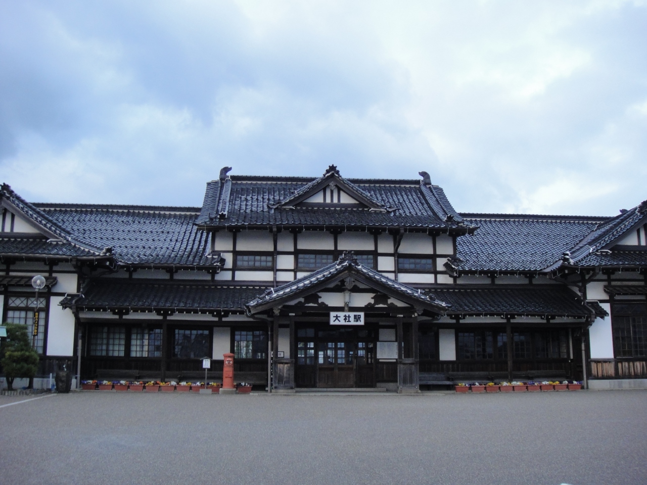 明治45年に開業した大社駅は、全国でもめずらしい神社様式を取り入れた木造平屋の駅舎です。当時の建物は、現在のものの半分程度の大きさでしたが、出雲大社の参拝客の増加とともに次第に手狭になり、大正13年に改築されました。平成2年JR大社線の廃止とともに駅舎は閉鎖となりましたが、今でも建物は大切に保存され、待合室など一部が公開されています。外観は純日本風ですが、中は西洋風で昔の照明器具や料金表、切符売場、電話機などが置かれています。残念ながら、訪れた時間が開館時間外で駅舎は閉まってしまいましたが、改札口を通って駅のホームまで行くことができました。駅の看板などは当時のままで面影があります。ホームの向かい側にはSLのD51も展示されています。開館時間は9:00~17:00。無料。駐車場あります。