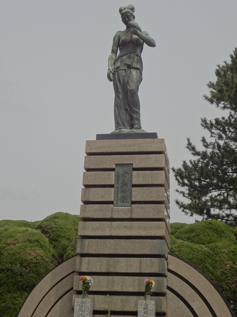平和の像は豊川公園の園内にあります。昭和40年に豊川海軍工廠の爆撃でなくなった人々の霊を慰めるためとともに、あわせて永遠の平和を祈願して建てられました。大理石と御影石の台座の上にそそり立つ乙女の像は、天平時代の女人をかたどったもので、深い哀愁の中に平和への祈りをこめた悲しくも尊い姿をしています。