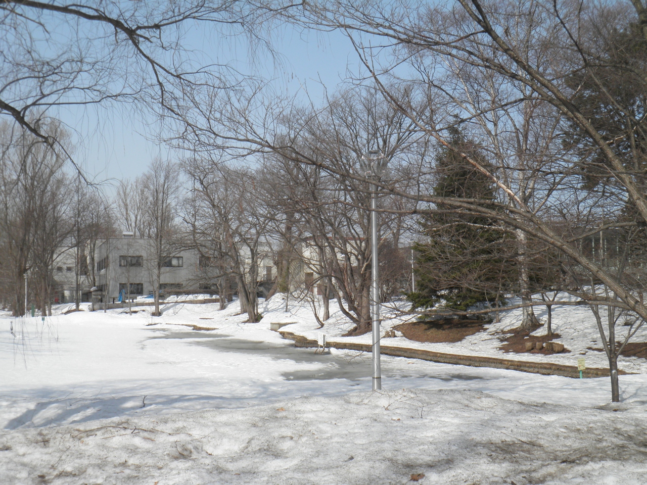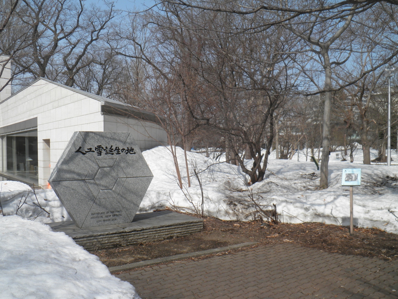 「雪は天から送られた手紙」という名言で有名な故中谷宇吉郎教授の氷雪研究の功績をたたえる六角形のモニュメントは、工学部と理学部の間にある大野池の側にあります。 大野池に周りはベンチもあって、観光の休憩にいいです。 自然の雪に悩まされる北国の人は「こんなに周りに雪が多いのに、なんでわざわざ人工でこさえるんだべ」「今年雪が多いのは言いたいことがおおいんだべさ」とつぶやくそうです。