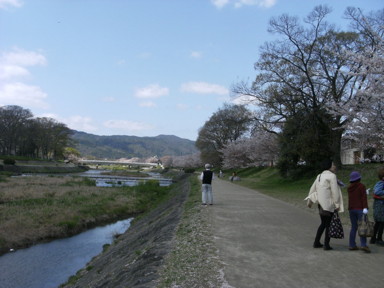土手に桜並木がずっと続いていてきれいです。北大路橋から北山大橋までの間の左岸にあるヤエベニシダレの「半木の道」が有名ですが、そのほかの区間も枝振りのりっぱなソメイヨシノがたくさん並んでいます。河川敷の道は舗装されていませんが、でこぼこのない走りやすい道なので、サイクリングにも最適です。