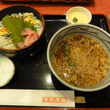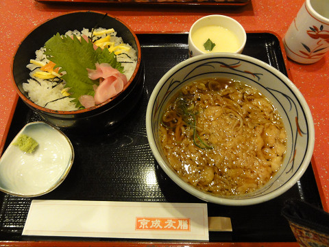 搭乗手続き済ませ、しっかり朝食を食べようとお店を探しましたが、ご飯が食べられるお店は開いてなくて、ここだけ開いてました。お寿司から麺類、丼、単品のおつまみ、デザートまで何でもある居酒屋ファミレスのような感じのお店です。焼き魚の朝食セットもありましたが、海鮮ちらしと蕎麦のセットを食べました。ちらしの具は大葉の陰に隠れる程でさっぱりしてましたが、お客も少なく、のんびり出来たので良しとしました。