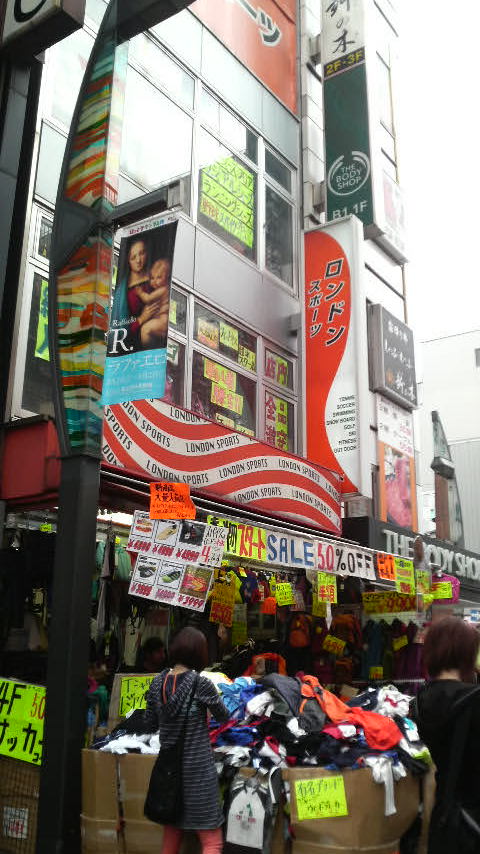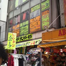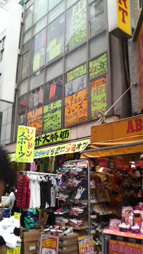 スポーツ用品(主にウエア、シューズなど)の激安ショップです。サッカー、フィットネス、ジョギング、ゴルフ、スイミングなどいろいろ揃います。アメ横界隈だけでも4~5軒店がありますが、店によって主にしている商品が若干違うように思います。